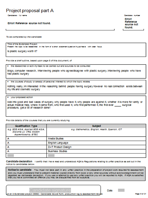 Eating disorders is a touchy subject and there were quite a few personal issues that could have made it difficult to keep the argument un-biased and so I changed to the topic of plastic surgery. I have an interest in this (I did my english coursework on plastic surgery and found it really interesting) and so thought it would be really interesting to do this as an extended project qualification subject.
